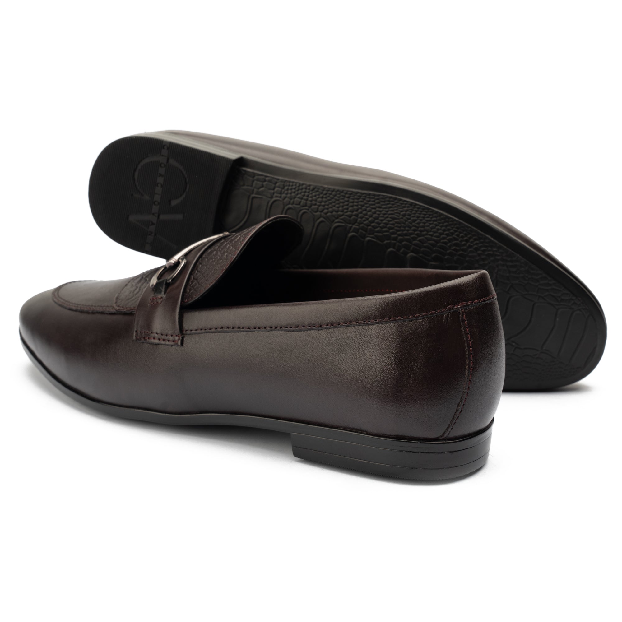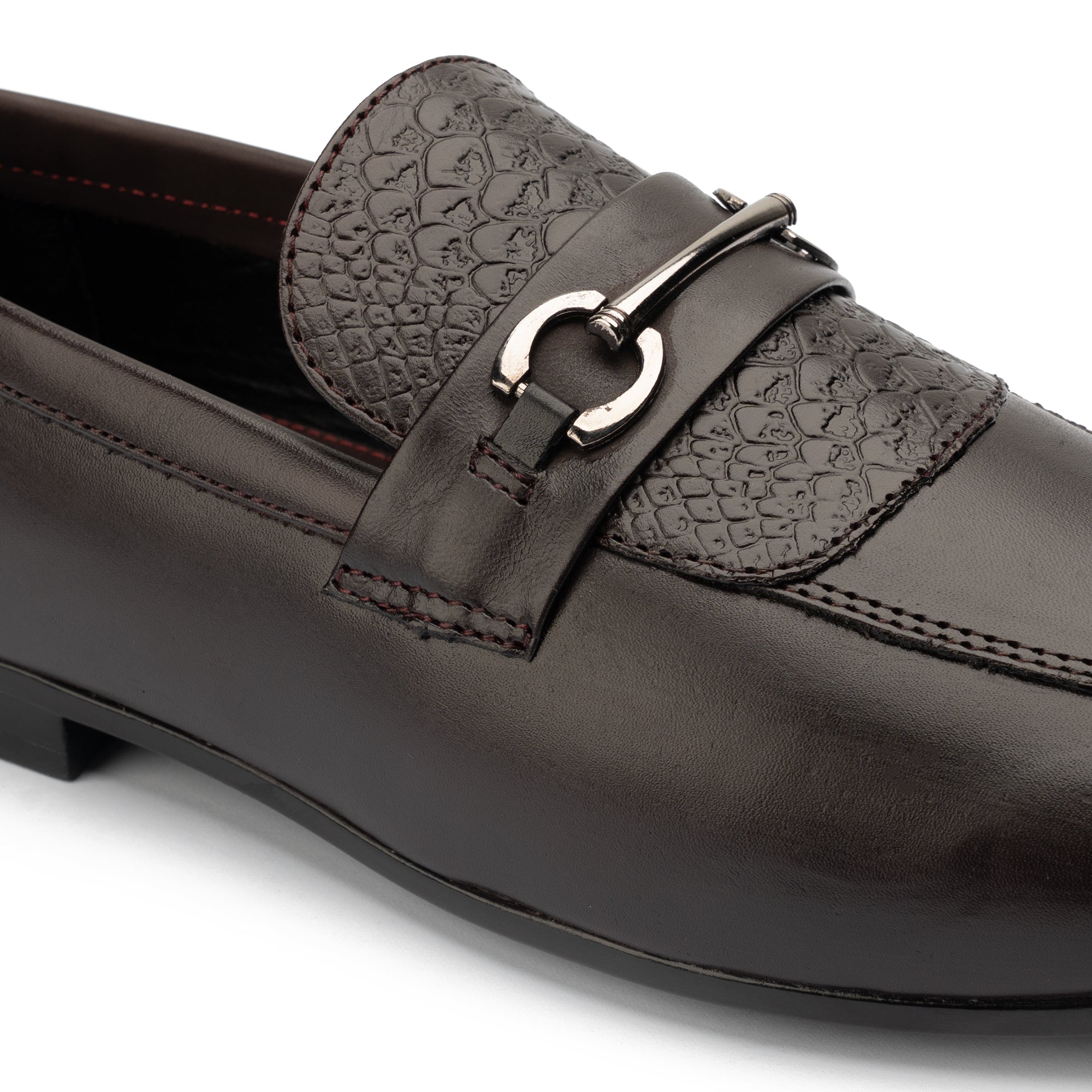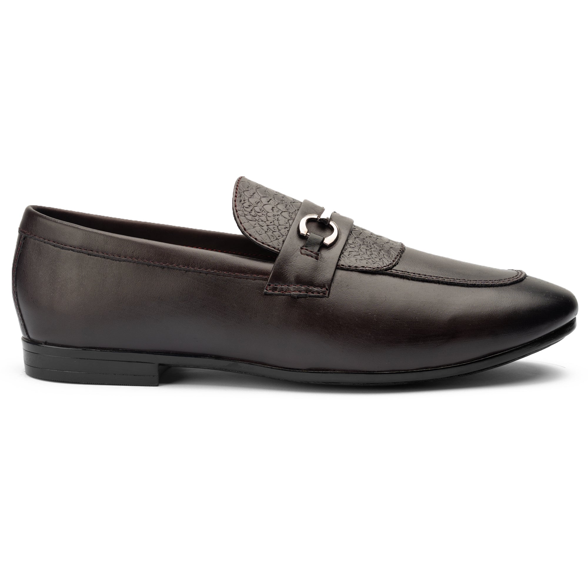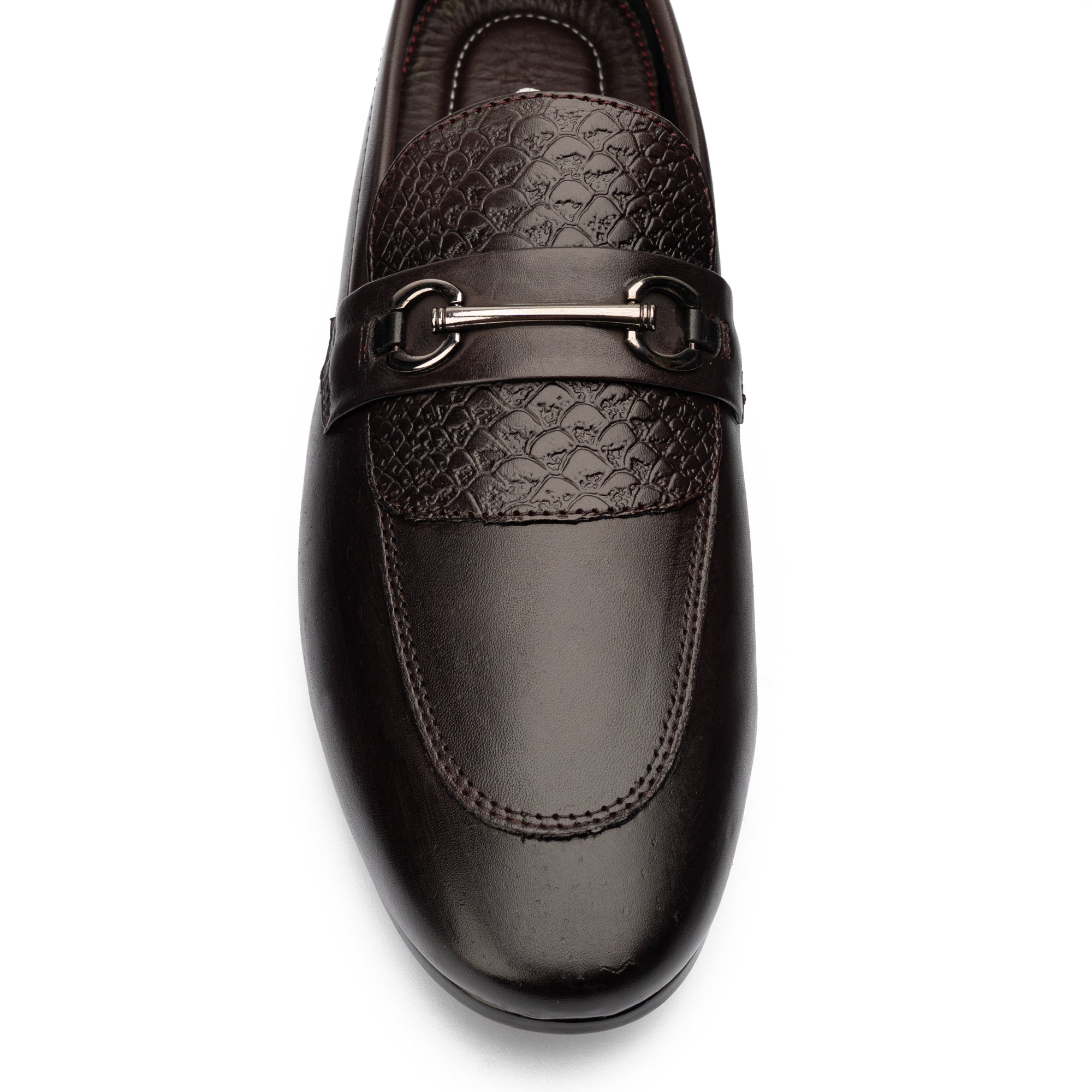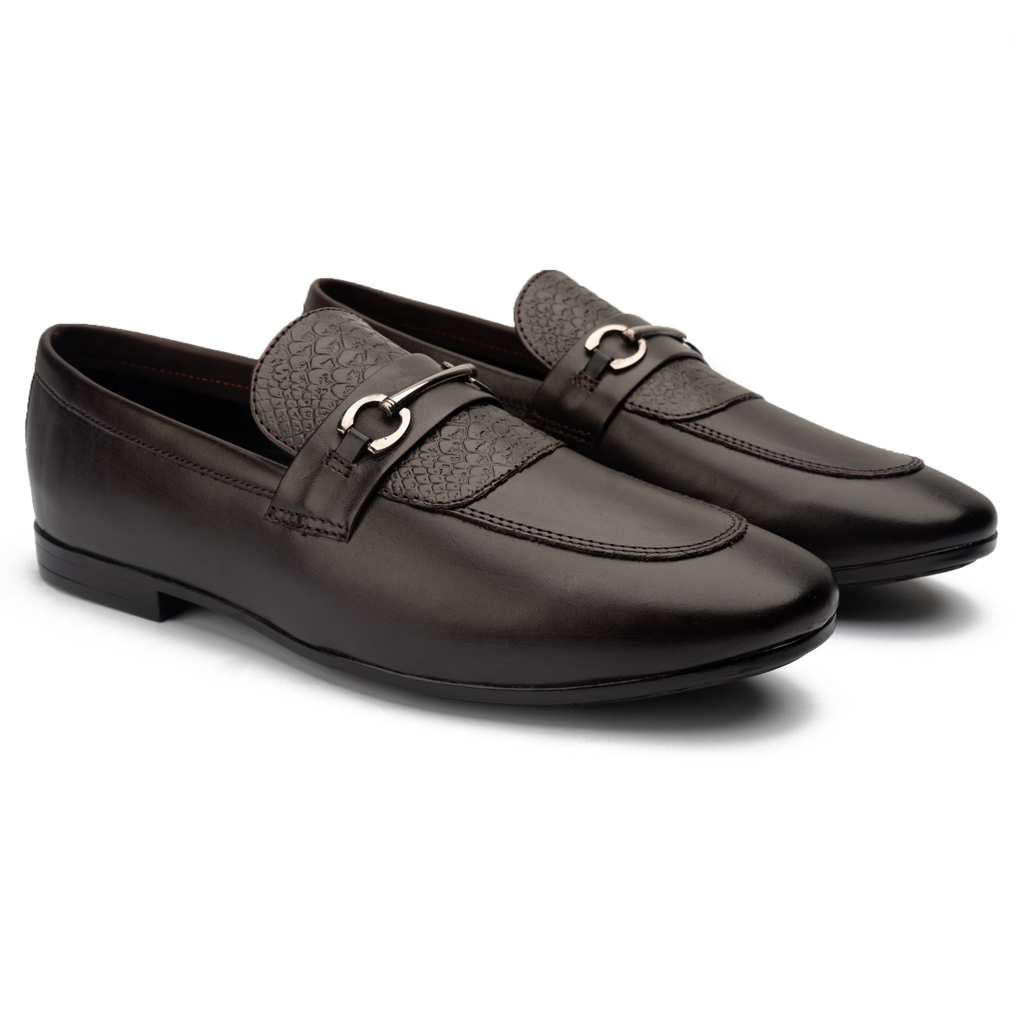 Crafted from rich brown leather with a textured vamp, this pair blends modern detail with classic elegance. Accented by a sleek metal buckle, it’s the perfect choice for refined formal style.