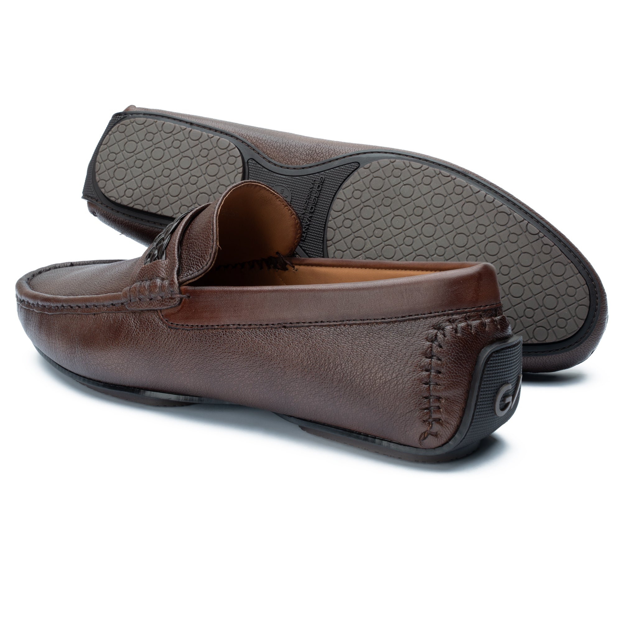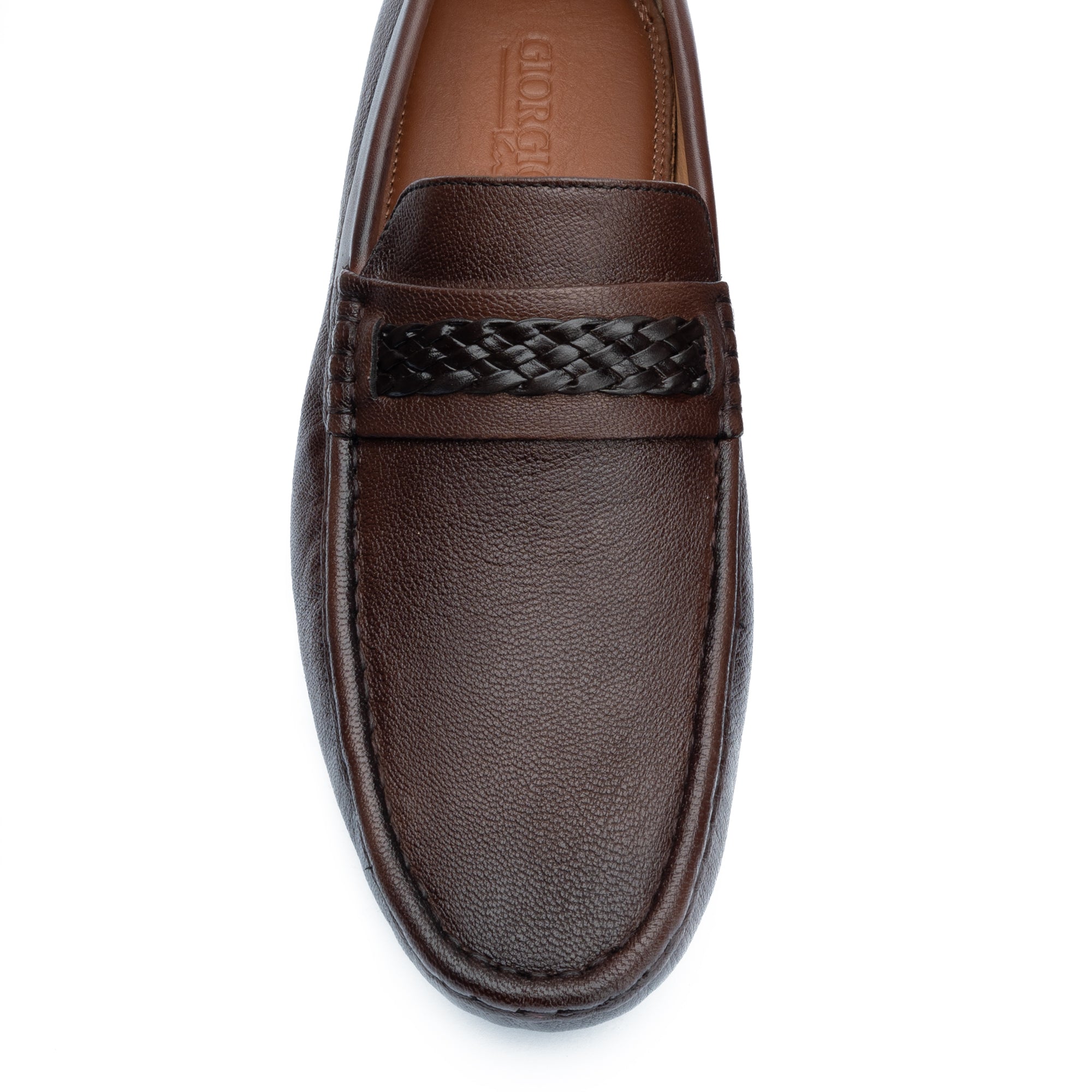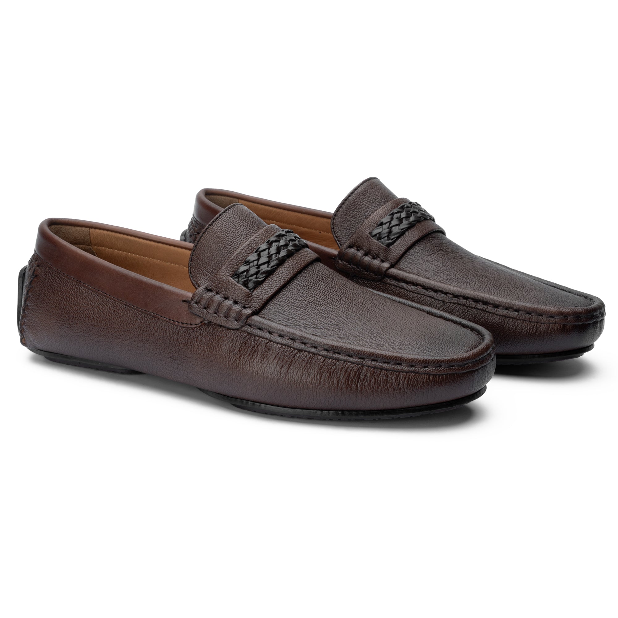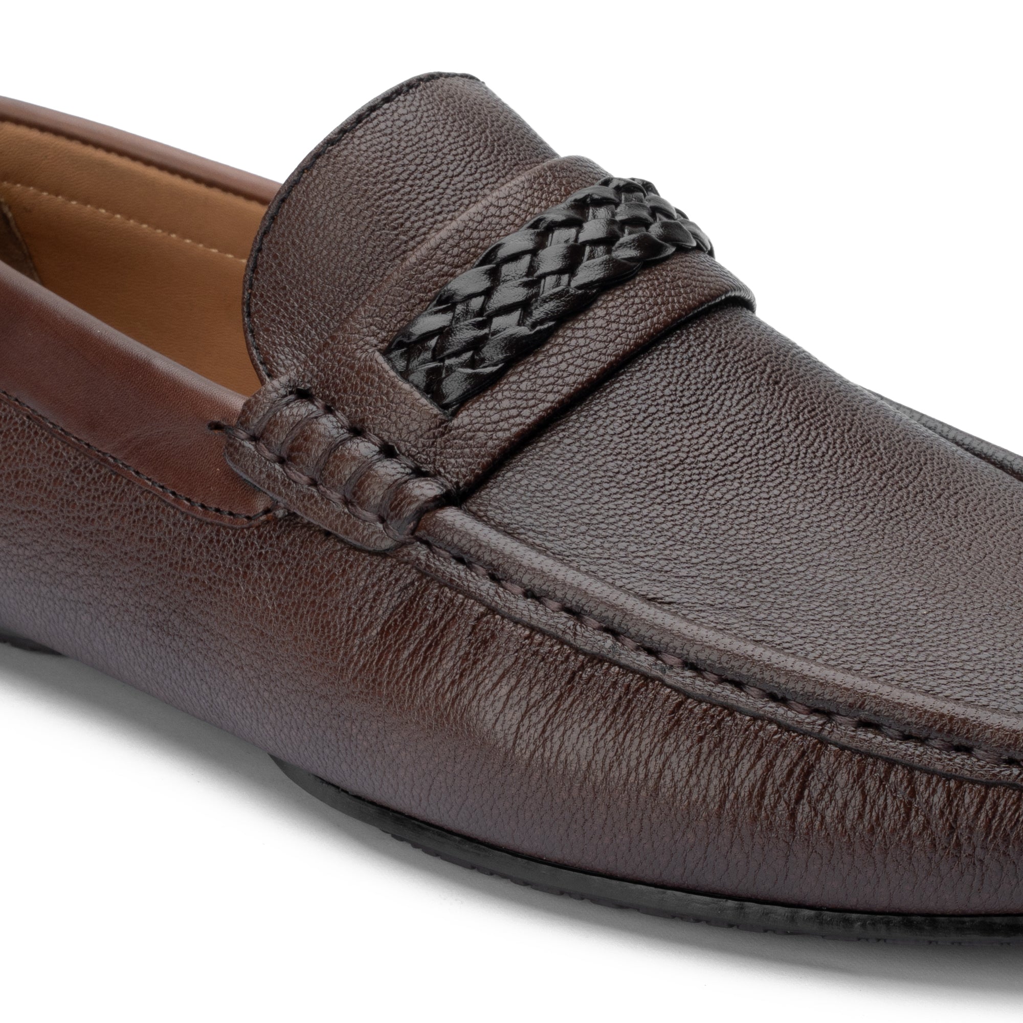 Crafted in rich brown leather with a signature woven accent, these loafers blend timeless elegance with modern detail. Perfect for refined everyday wear or elevated evening style.