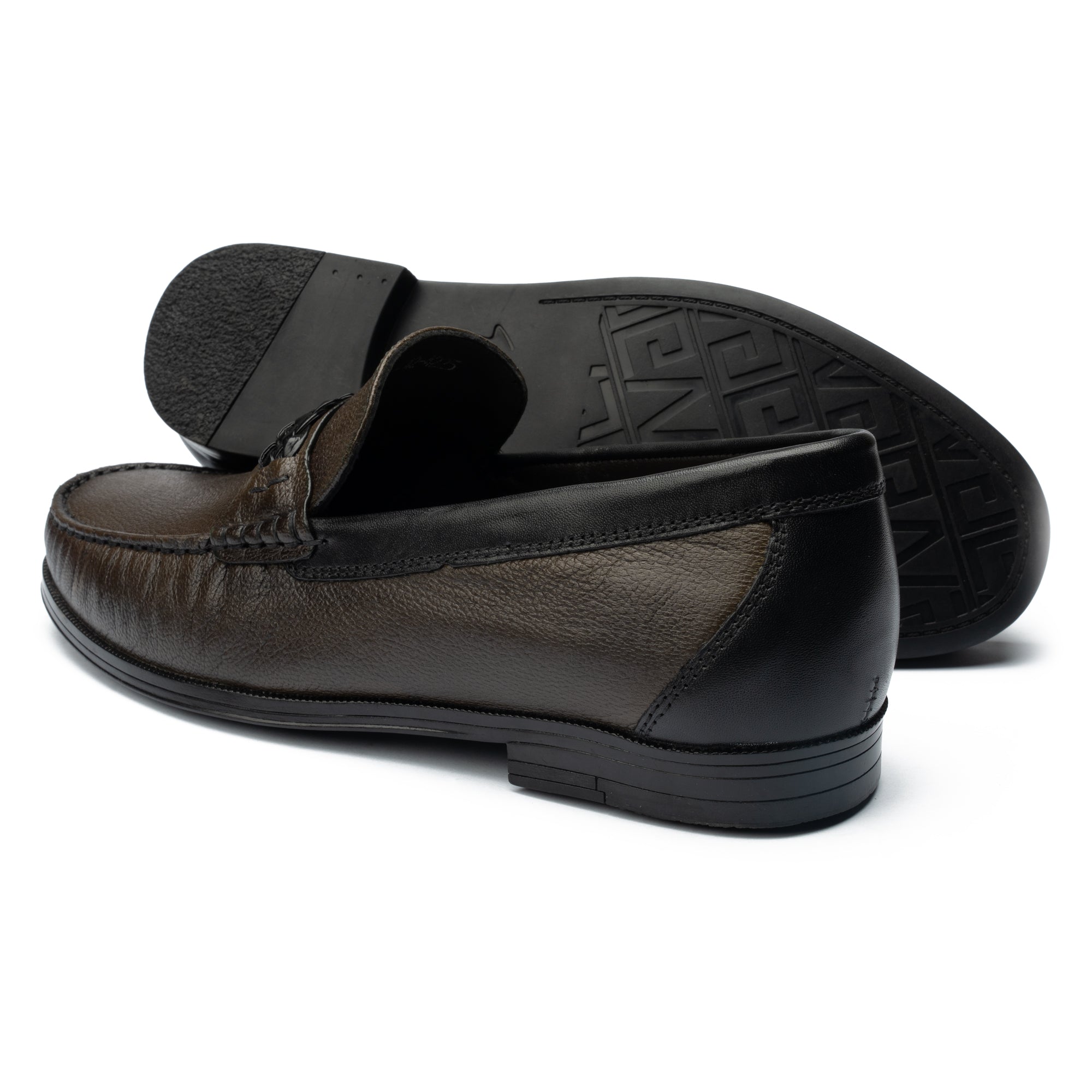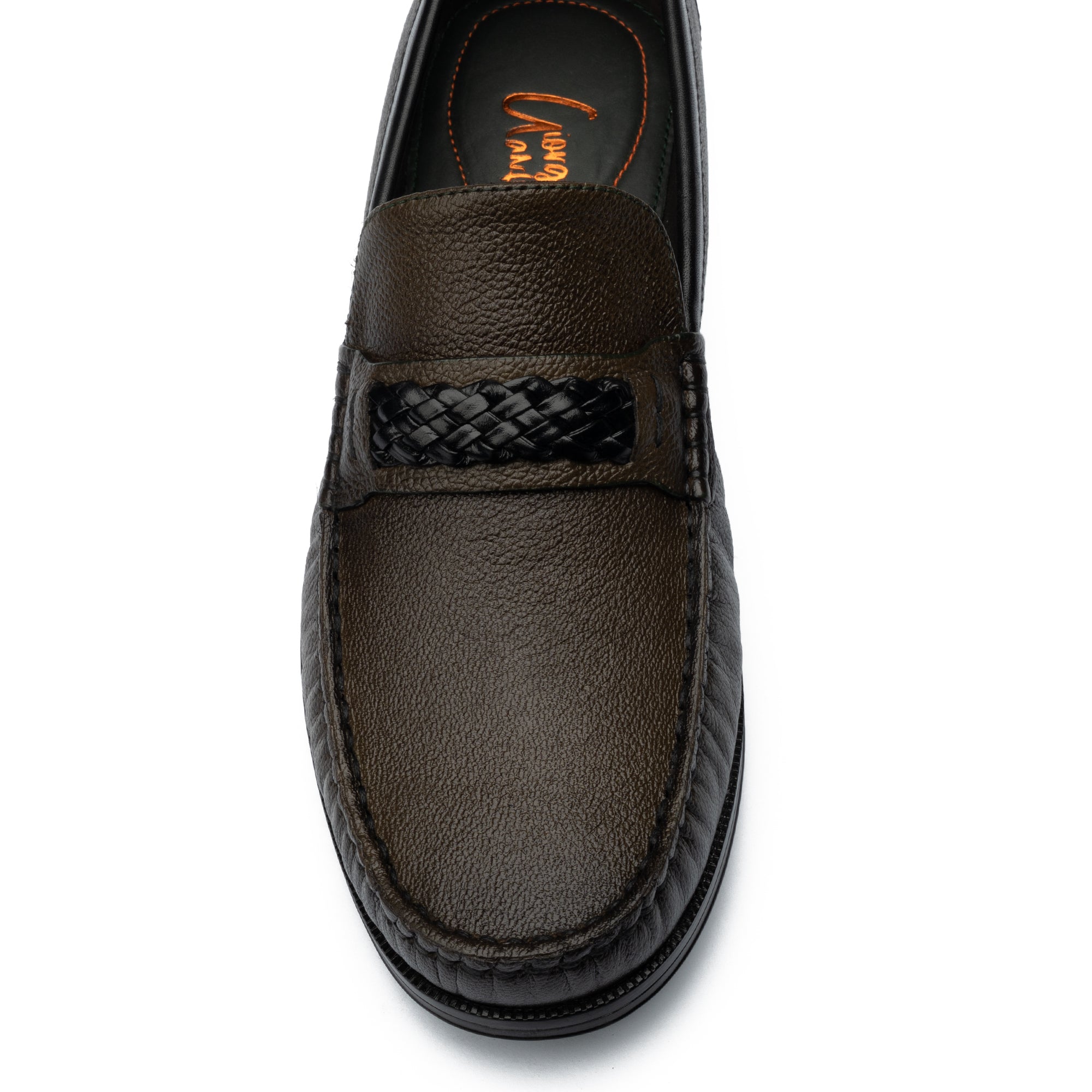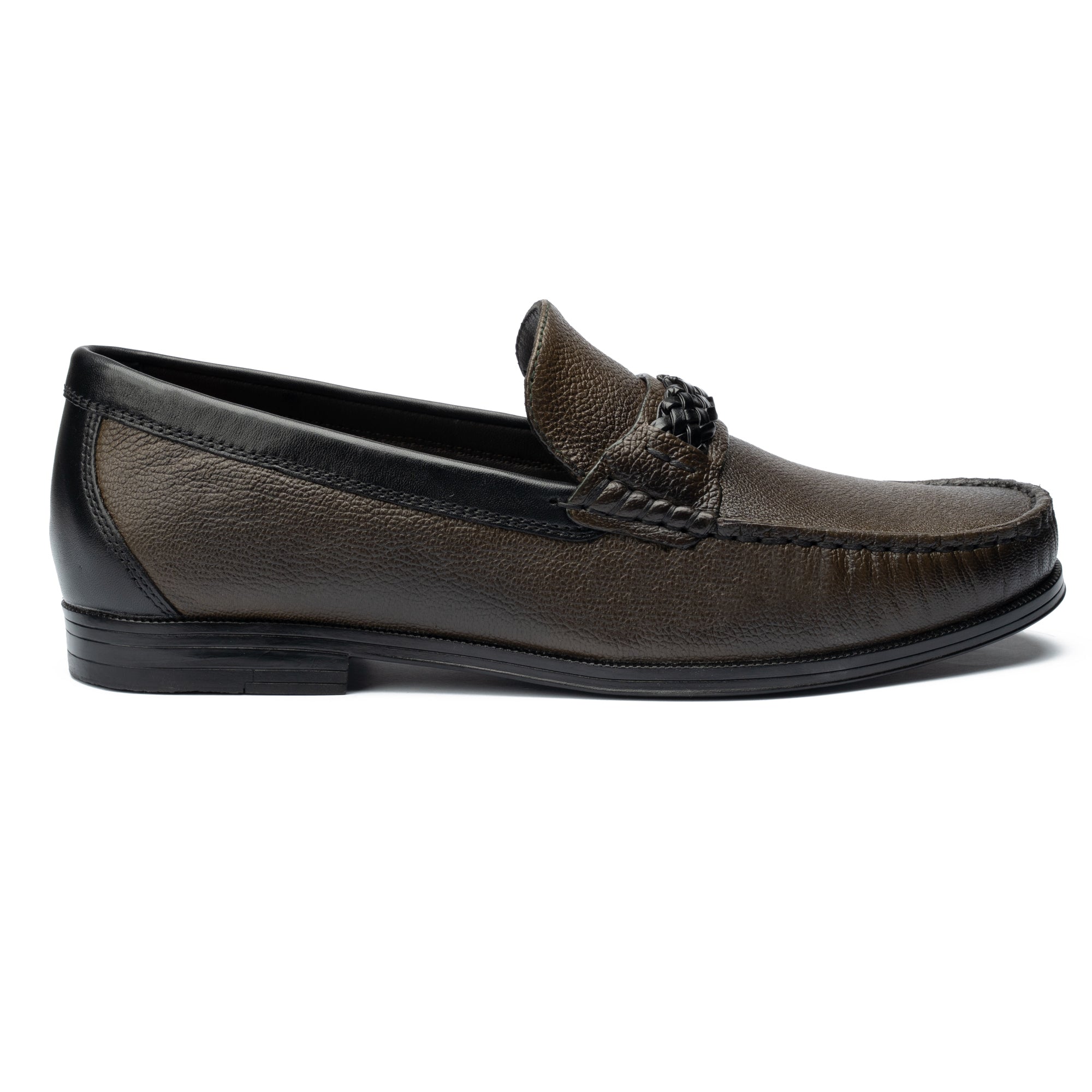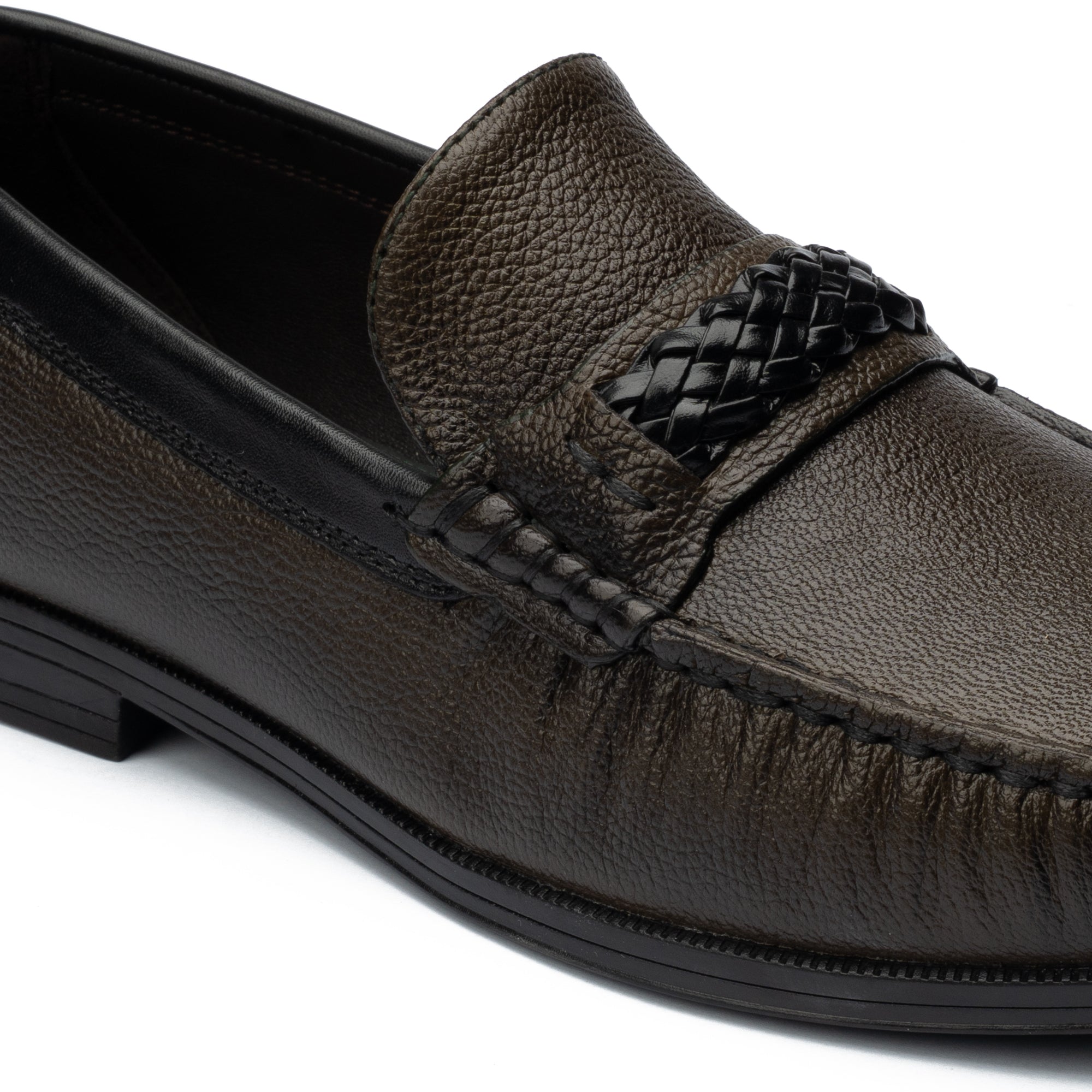 Classic moc-style detailing meets a modern woven accent for a refined finish.