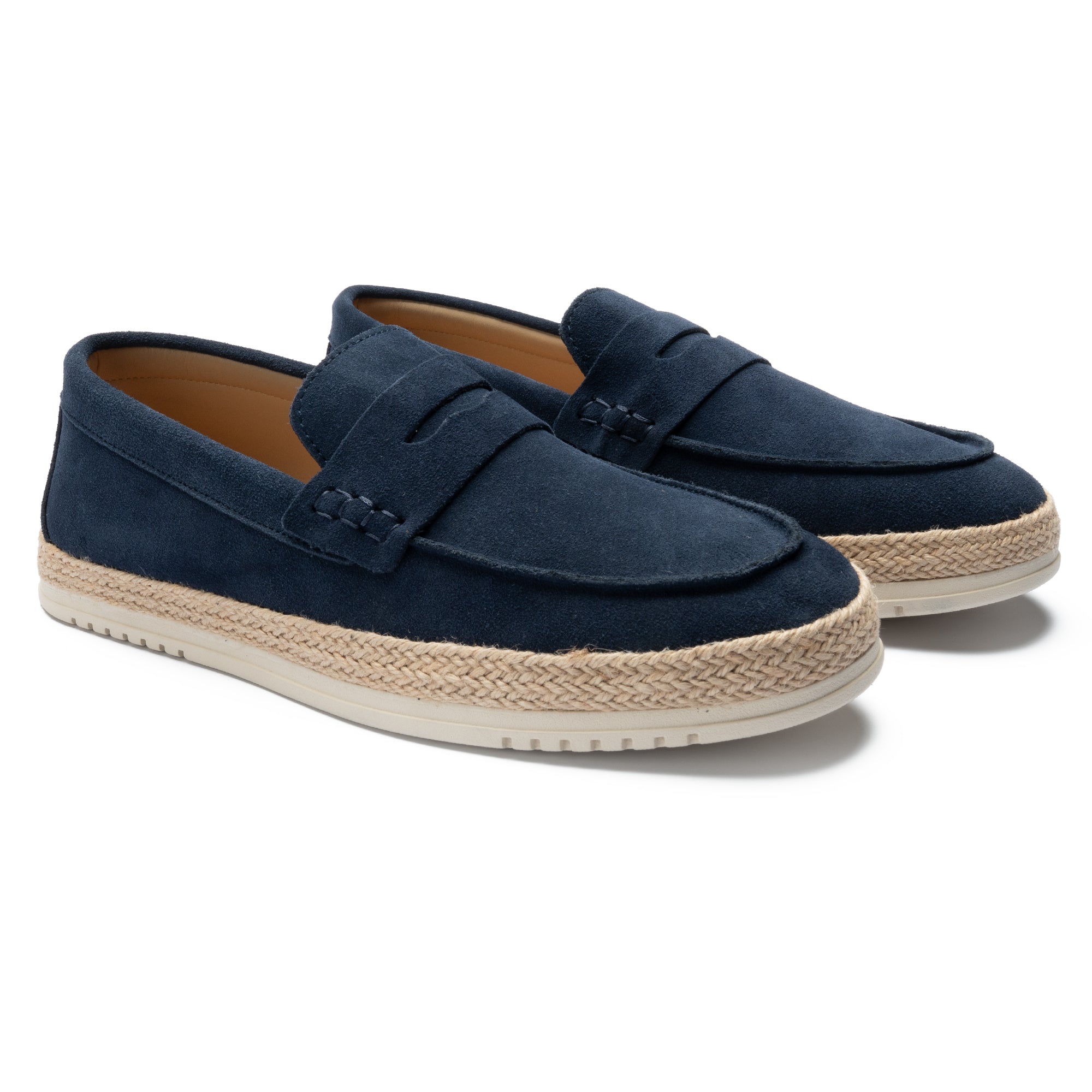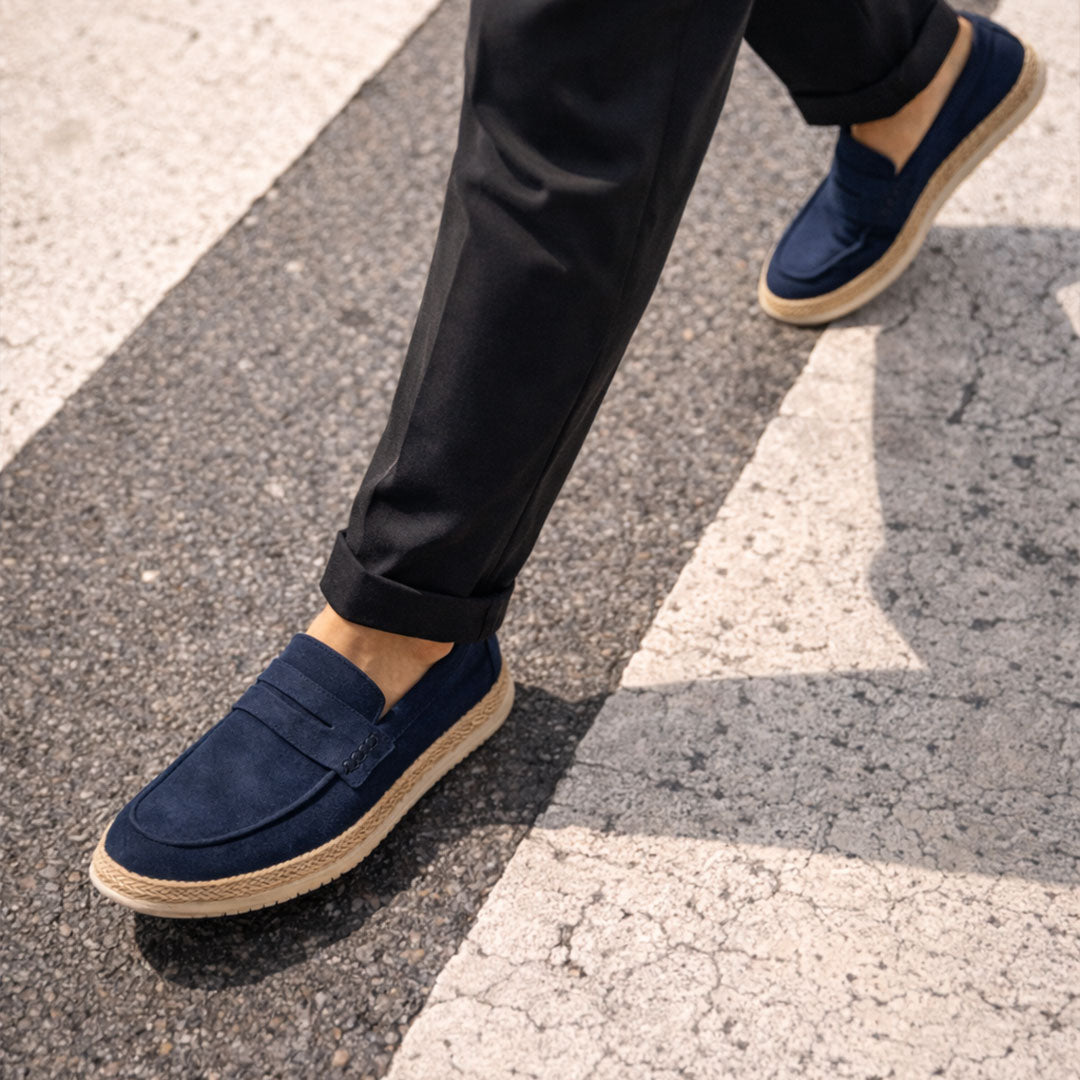 A modern loafer crafted in rich navy suede and natural jute detailing.