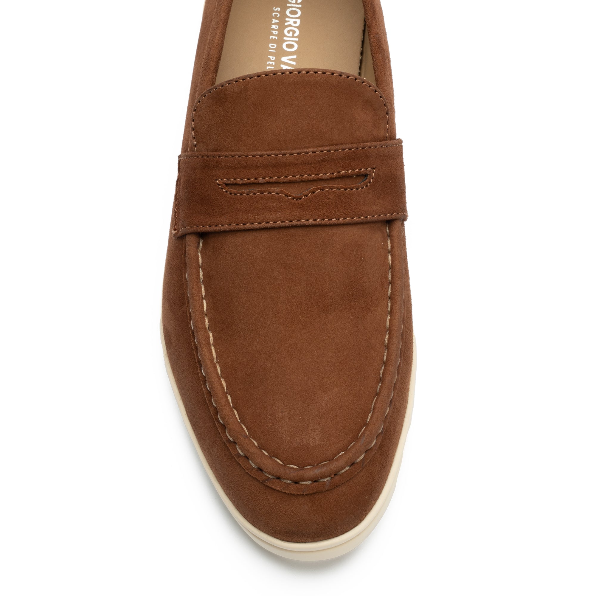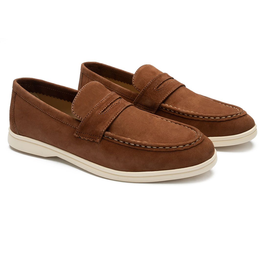 Soft brown suede shoe with white contrast sole and stitching — a perfect balance of casual comfort and refined elegance.