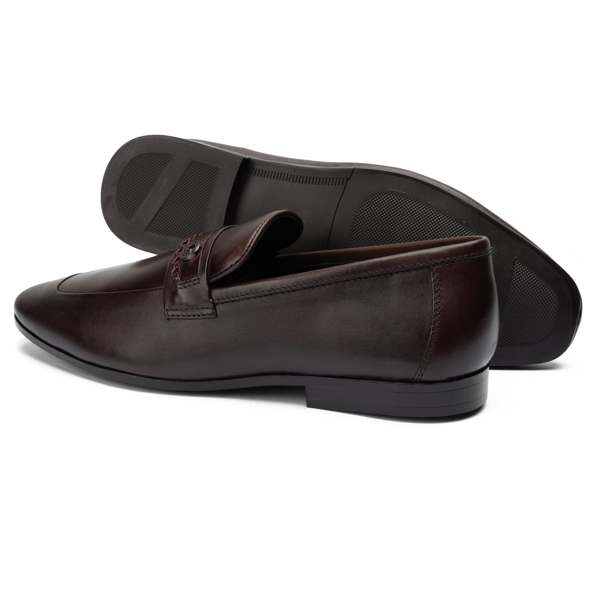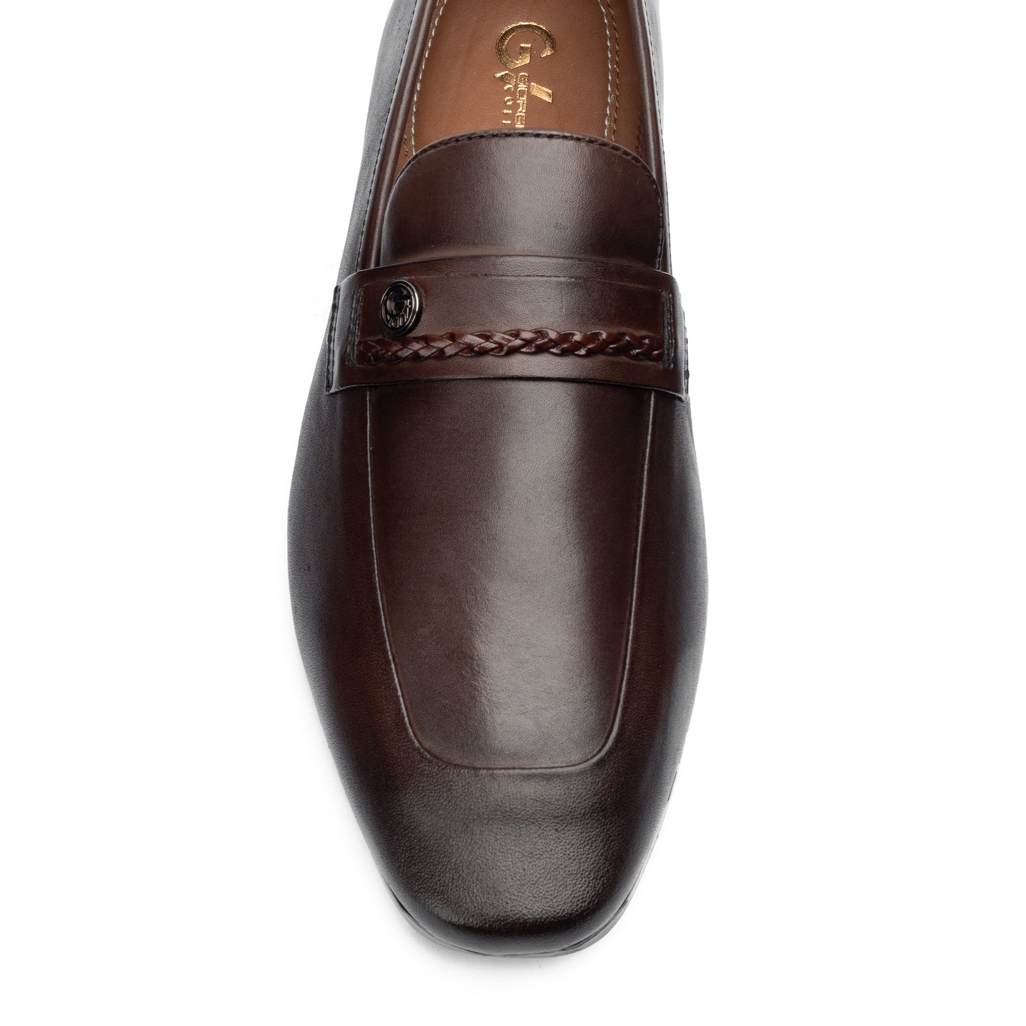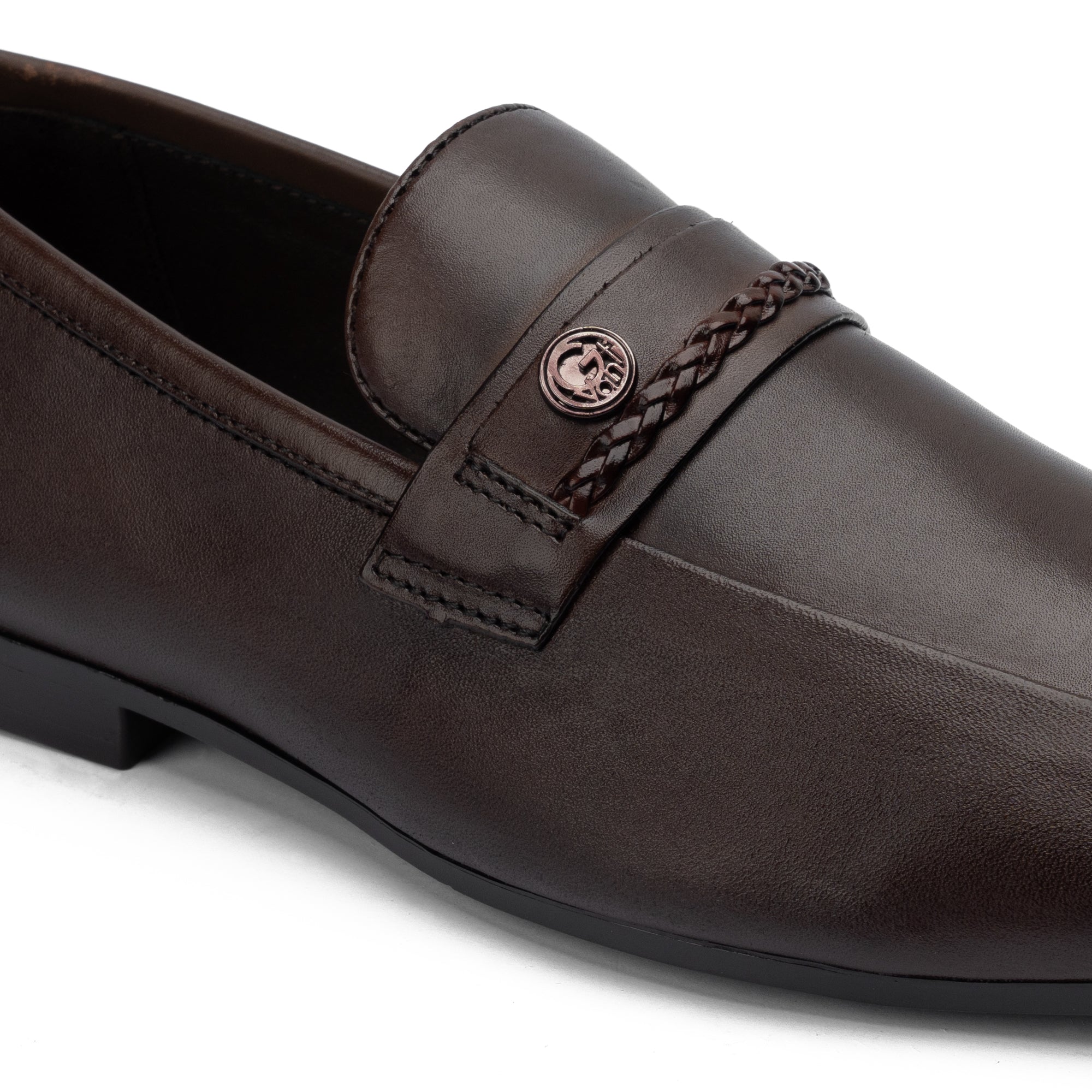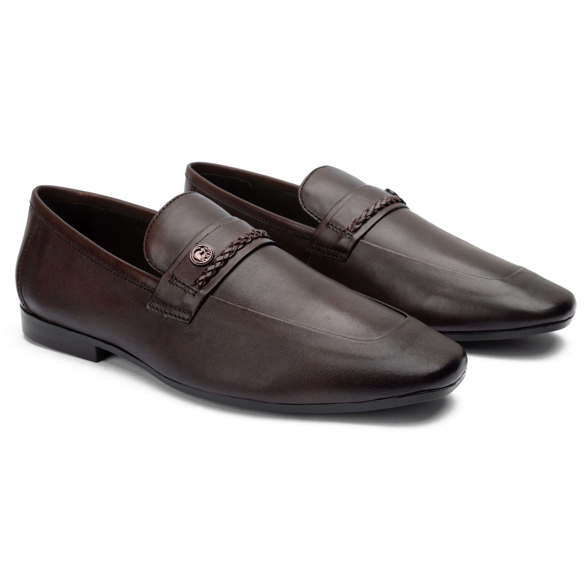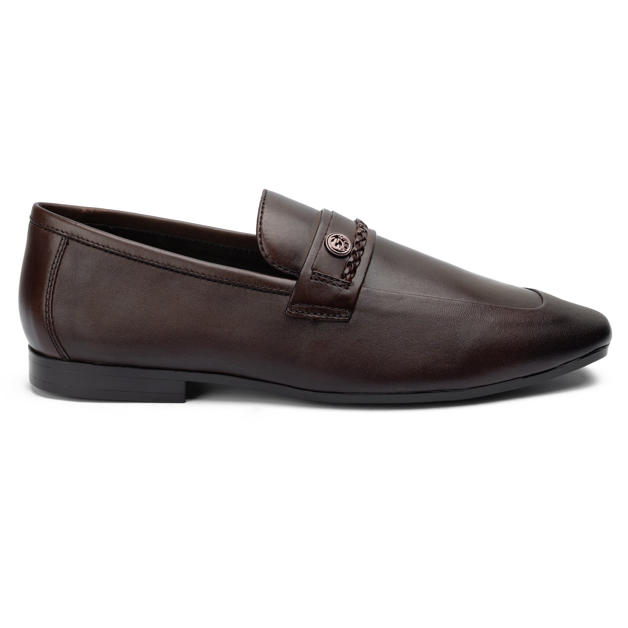 Crafted in sleek brown leather, this pair features a braided strap accent with a signature emblem. A modern classic that blends minimal elegance with refined sophistication.