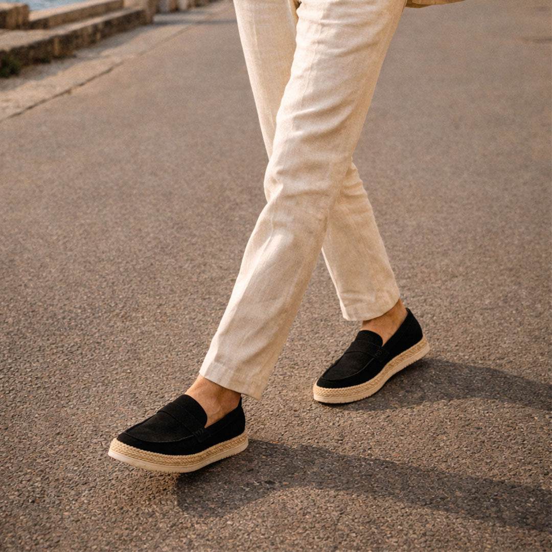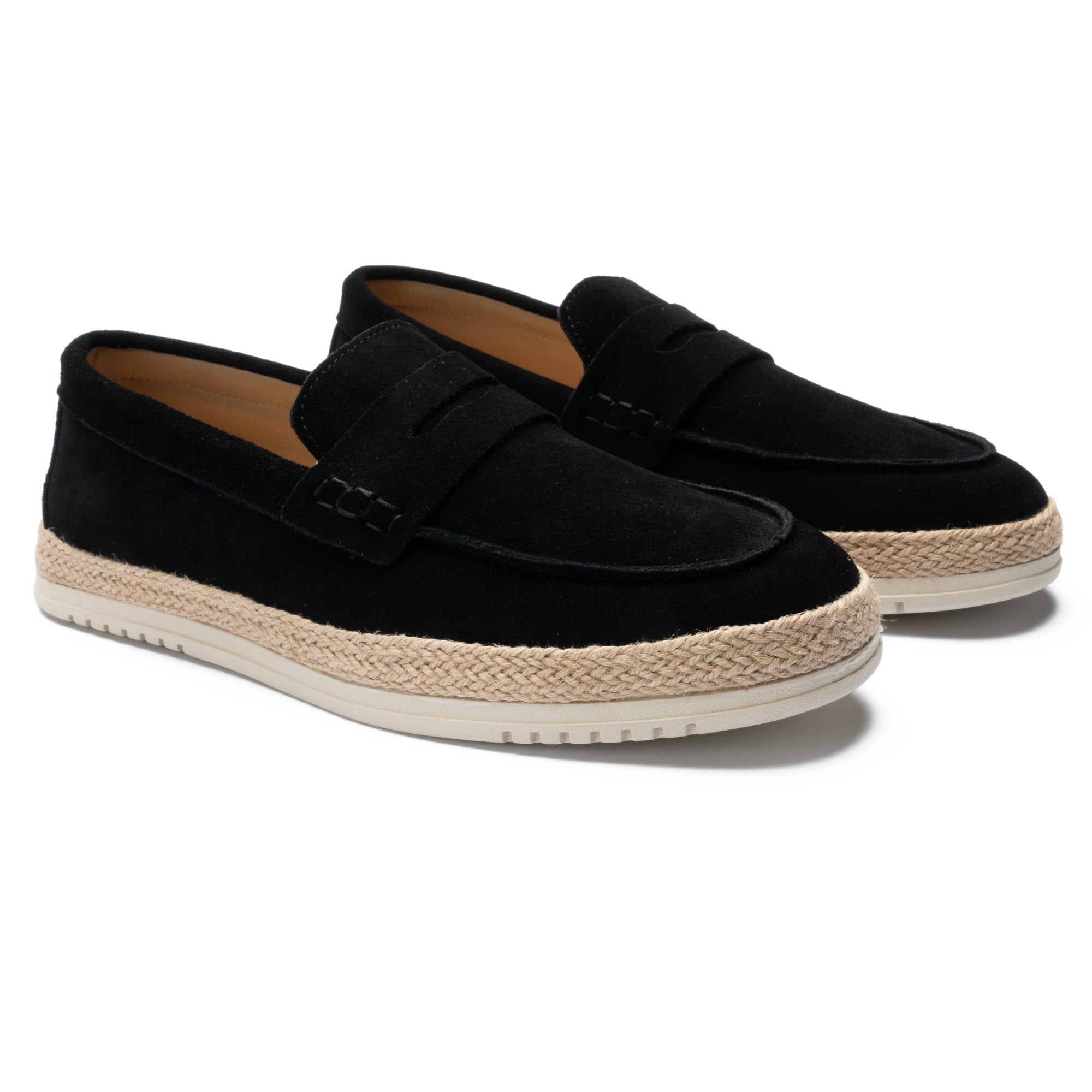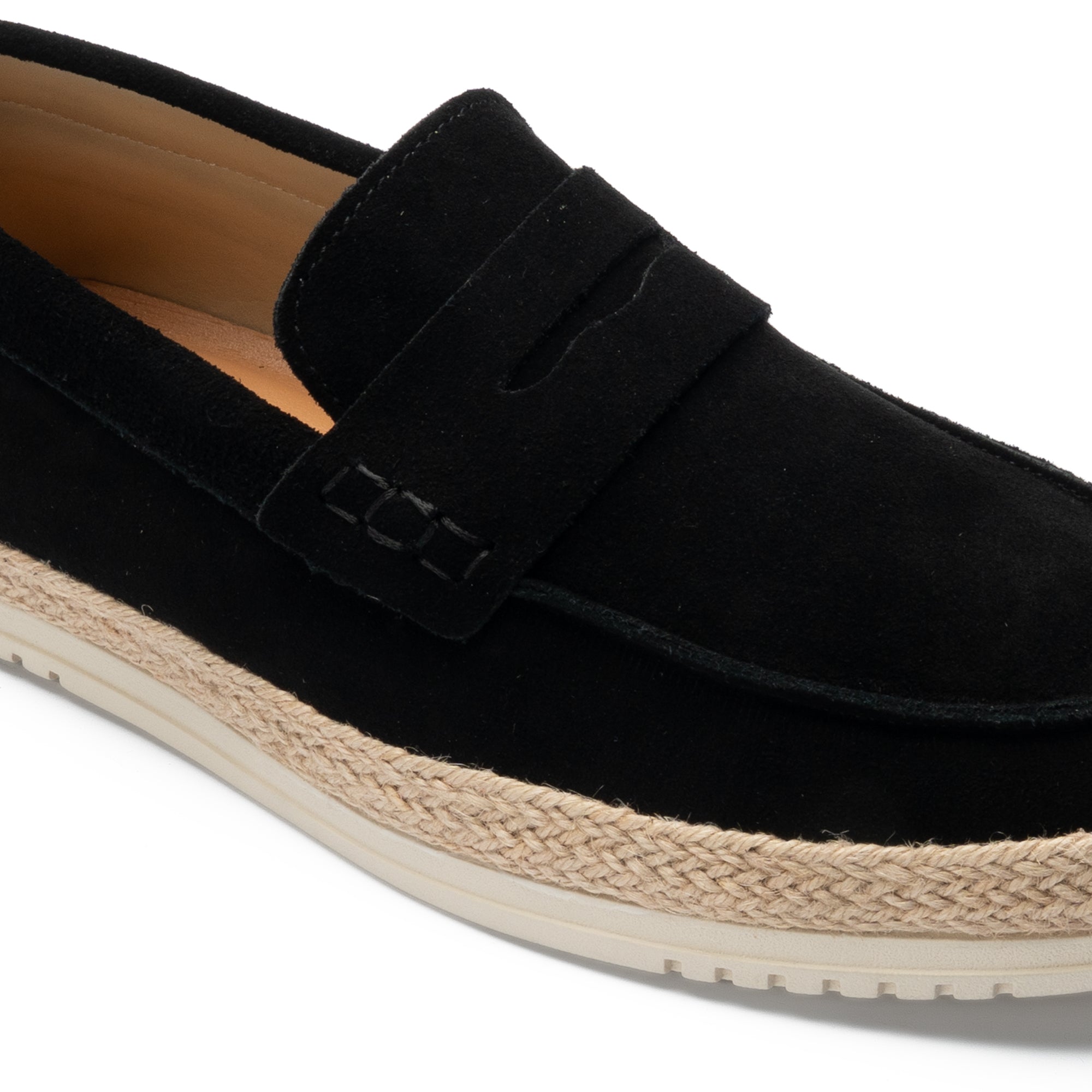 A modern loafer crafted in rich black suede and natural jute detailing.