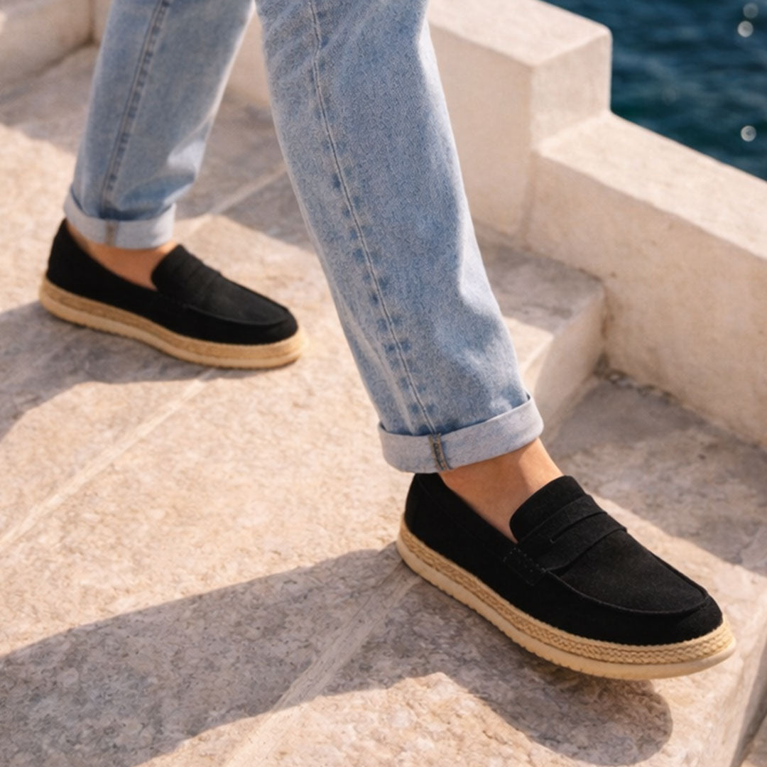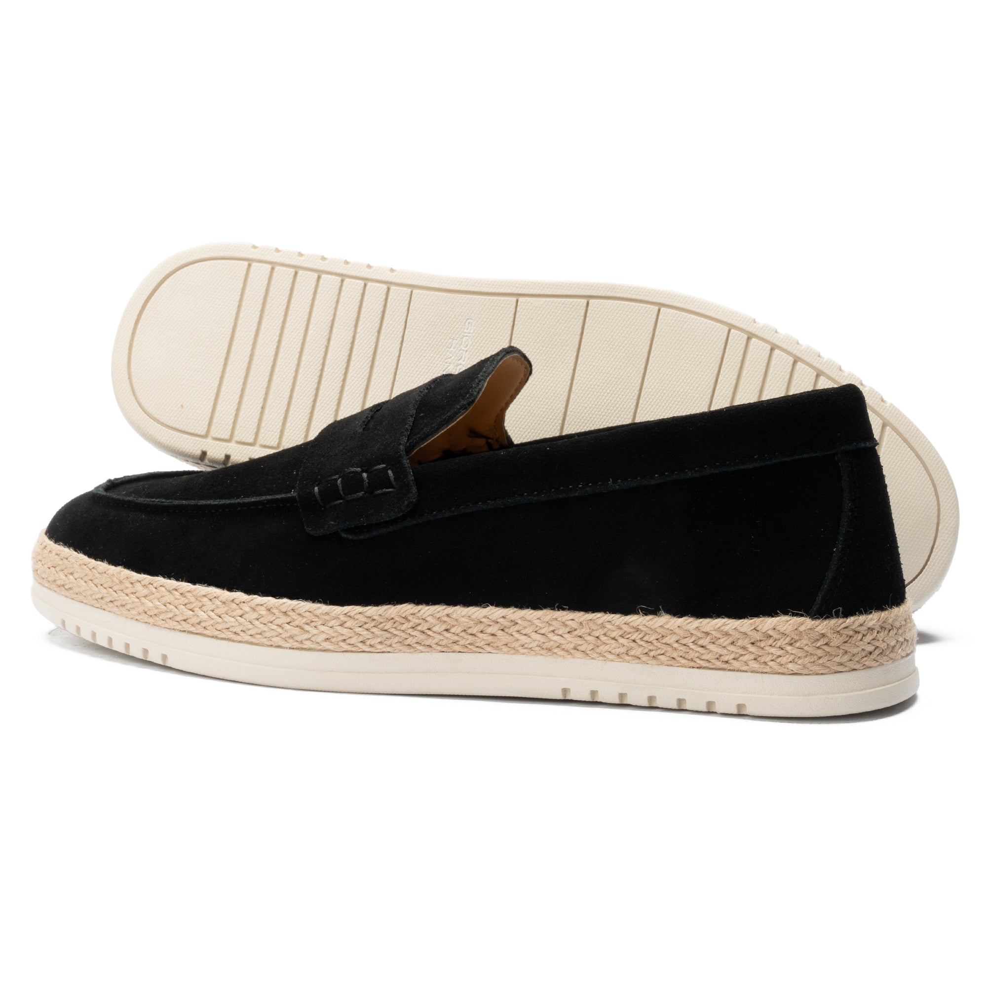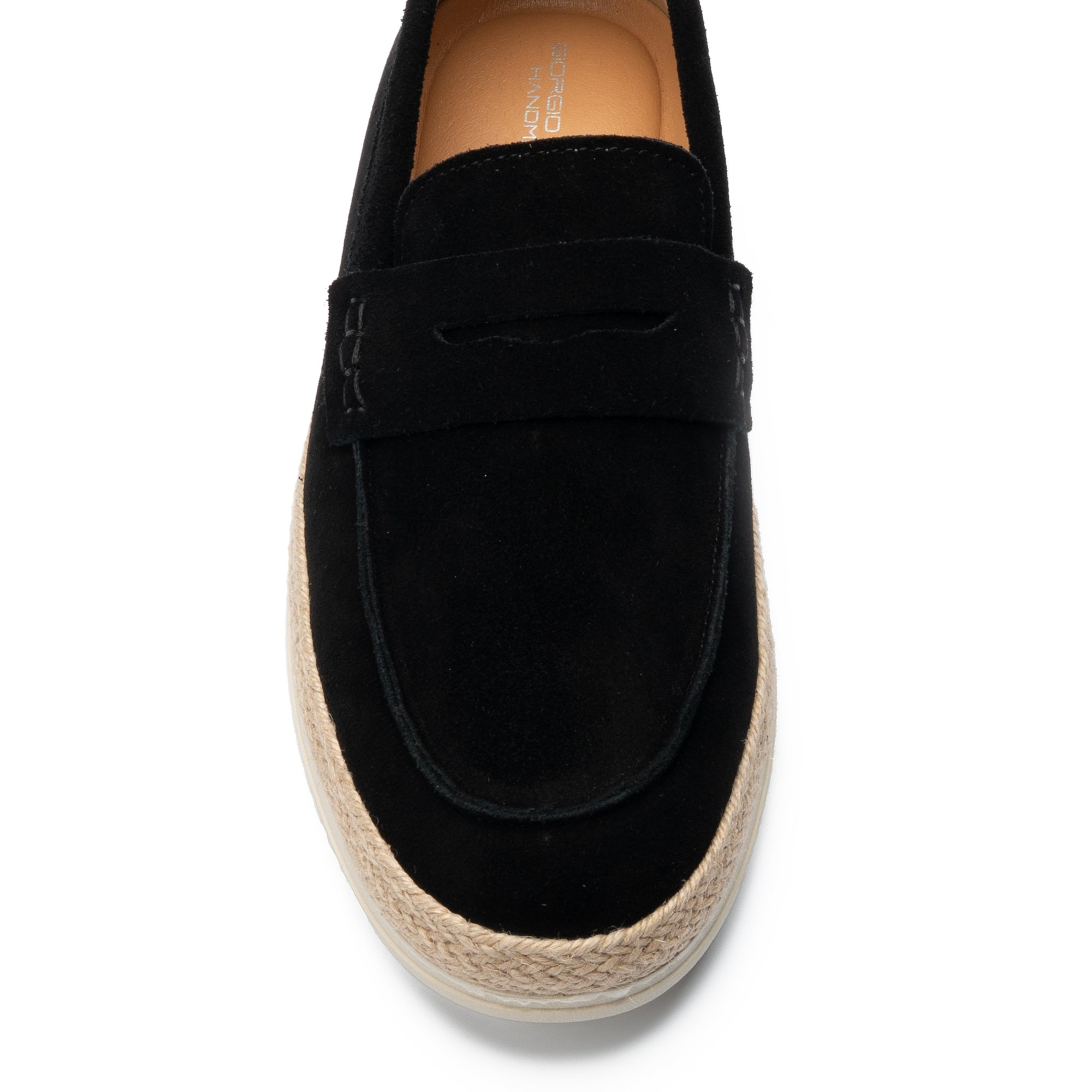 A modern loafer crafted in rich black suede and natural jute detailing.
