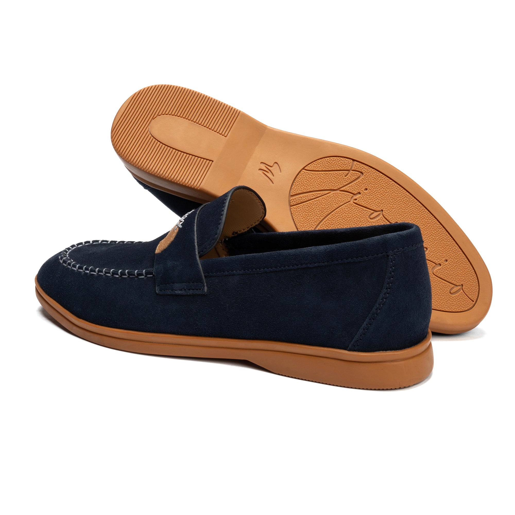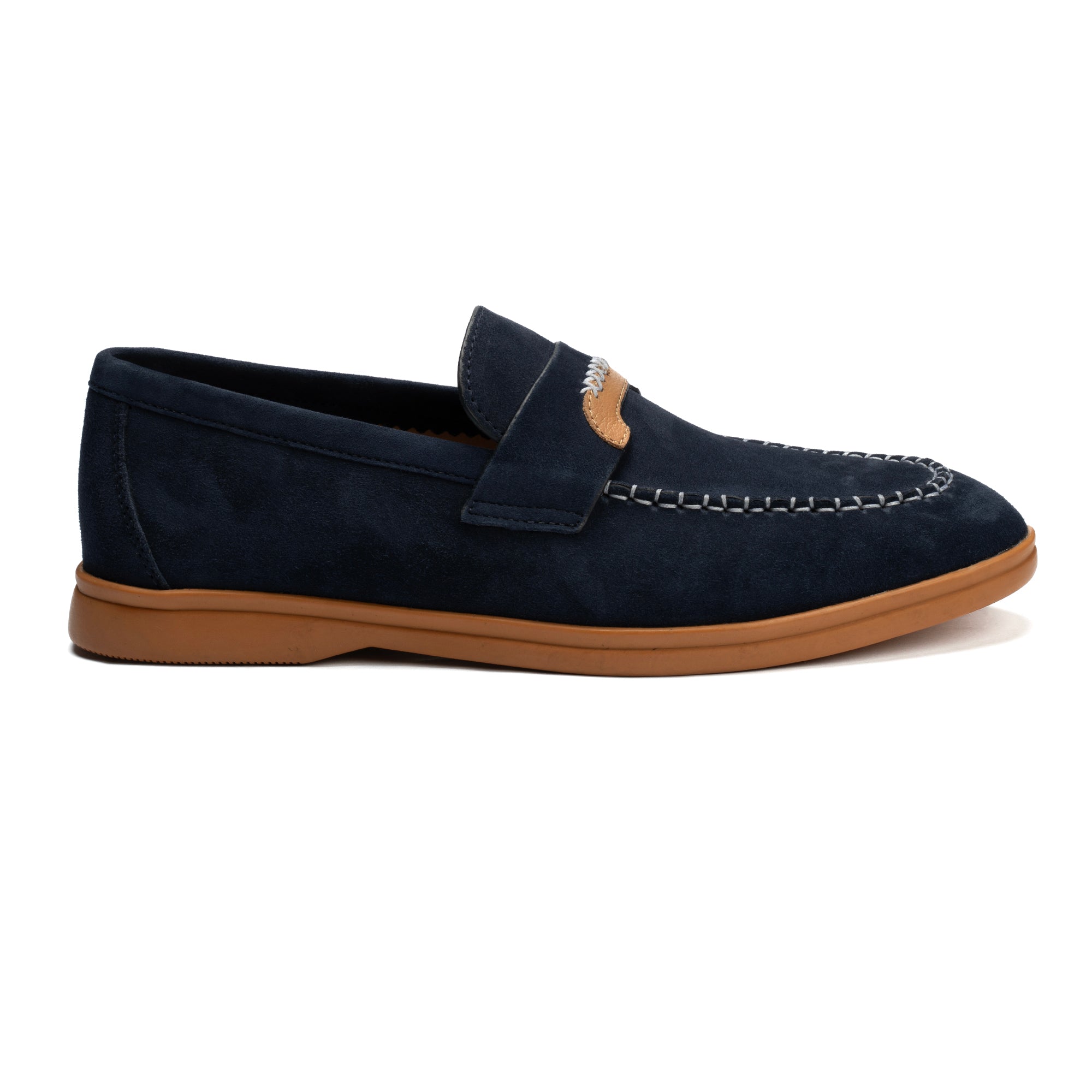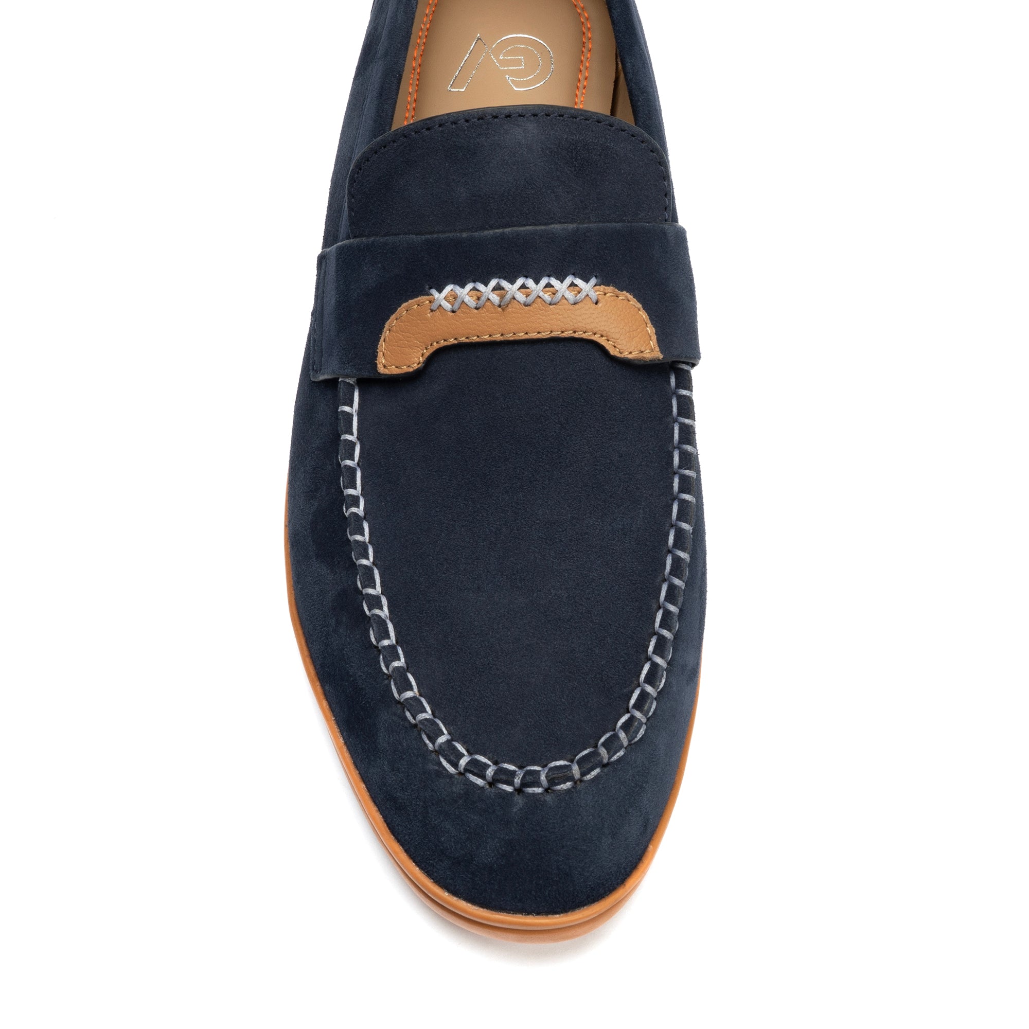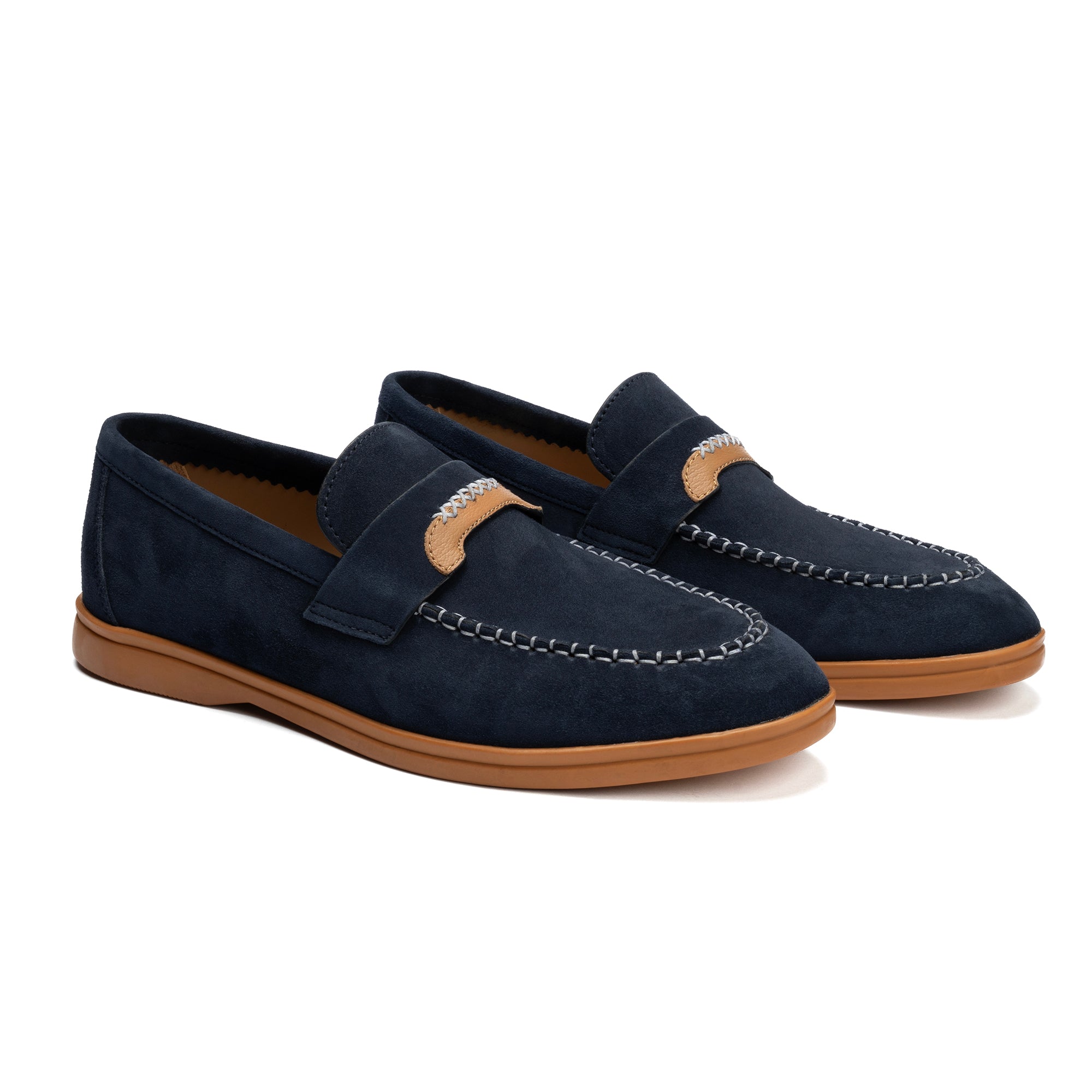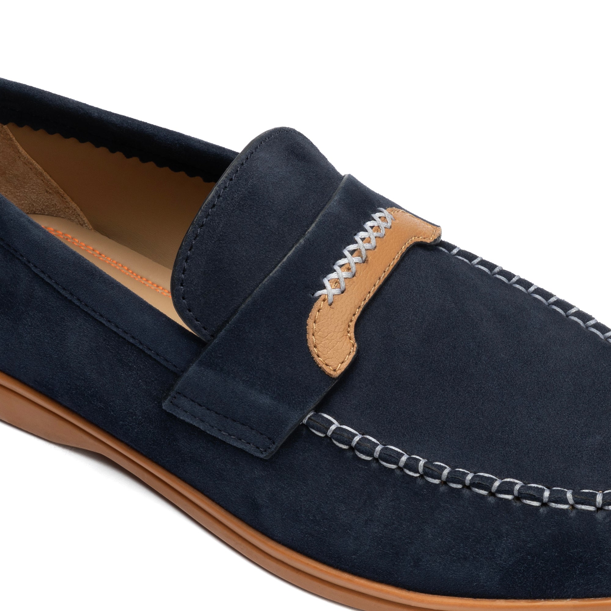 Blue suede loafers with contrasting leather detail, blending casual elegance with comfort.